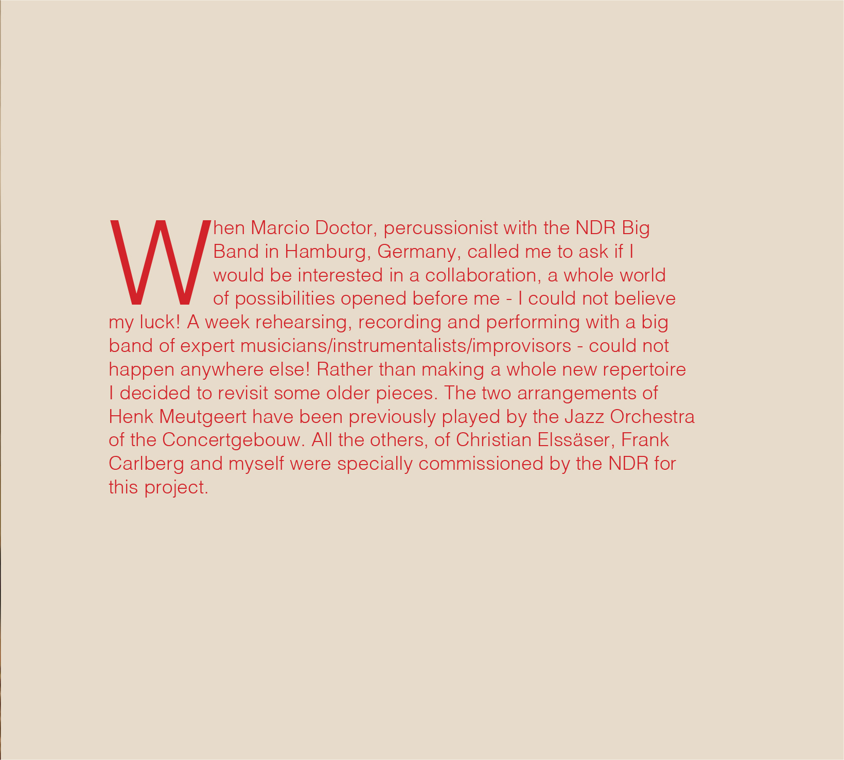 When Marcio Doctor, percussionist with the NDR Big Band in Hamburg, Germany, called me to ask if I would be interested in a collaboration, a whole world of possibilities opened before me - I could not believe my luck! A week rehearsing, recording and performing with a big band of expert musicians/instrumentalists/improvisors - this could not happen anywhere else! Rather than making a whole new repertoire I decided to revisit some older pieces. The two arrangements of Henk Meutgeert have been previously played by the Jazz Orchestra of the Concertgebouw. All the others, of Christian Elssäser, Frank Carlberg and myself were specially commissioned by the NDR for this project. 1. Sweet-Briar/Southwesterly - a medley of two recent pieces written for my 'Fragile' Quartet 2. Igor - a tribute to Stravinsky originally on 'Tunes for Horn Guys', (Ramboy #08). The collective improvisations were exciting. 3. Anomalous Soul - a piece Fred Hersch, Mark Helias and I first played on 'Chicoutimi' (Ramboy #06). 4. Brunheiras - recorded a few times before (Ramboy #04, #23). Christian Elsässer's arrangement is very beautiful - I wish I could write such a lovely chord as the one at the end of the first phrase! 5. Odin - another trio piece from 'Bering' (Ramboy #11); We did with this one with my 'Bigtet' a few years ago. Fiete plays fantastic! 6. Fogo von Slack - a trio for clarinets (Ramboy #08). 7. Shotgun Wedding - An Ellingtonian mood piece originally written for Available Jelly (Ramboy #07). Henk Meutgeert's arrangement brings out the best. 8. Providence - 1977 on the train from Boston to New York City under the heavy influence of Dewey Redman (Ramboy's #1, 2 & 26). Frank Carlberg laid down his quirky magic on this one, and Claus Stötter & Klaus Heidenreich made it sound as if we could hear each other! 9. Trouble House - 'Dylanesque', big thanks to Sebastian Stein and Sandra Hempel for their wonderful playing on this one. (Ramboy #24) 10. Sanctuary - from the first recording of the 'Fragile Quartet' (Ramboy #25), for my mother, Tam Moore, who speaks only truth and kindness when faced with falsehood and hate. |