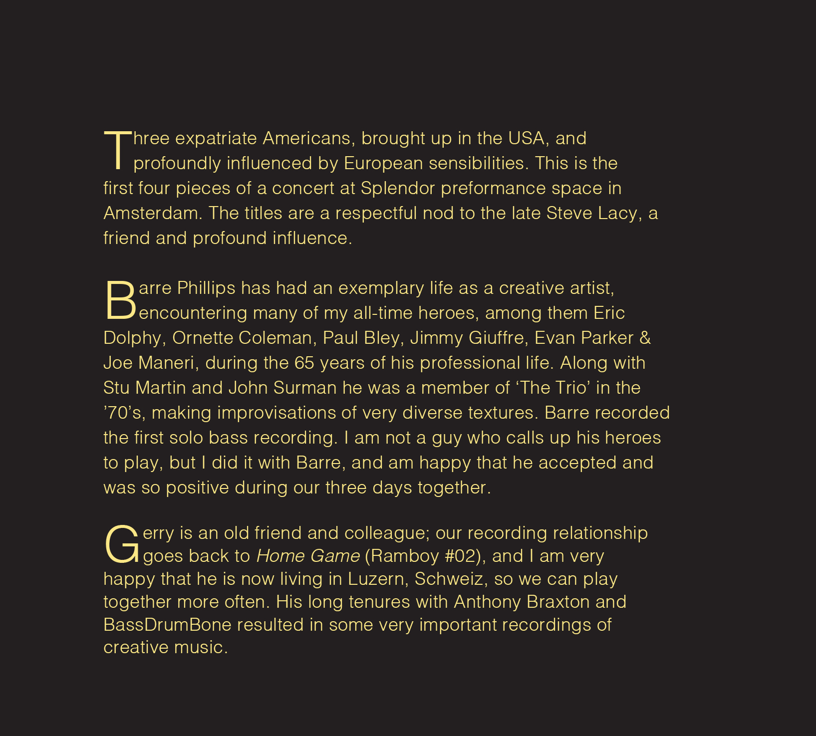 Three expatriate Americans, brought up in the USA, and profoundly influenced by European sensibilities. This is the first four pieces of a concert @ Splendor performance space in Amsterdam. The titles are a respectful nod to the late Steve Lacy, a friend and profound influence. Barre Phillips has had an exemplary life as a creative artist, encountering many of my all-time heroes, among them Eric Dolphy, Ornette Coleman, Paul Bley, Jimmy Giuffre, Evan Parker & Joe Maneri, during the 65 years of his professional life. Along with Stu Martin and John Surman he was a member of 'The Trio' in the '70's, making improvisations of very diverse textures. Barre recorded the first solo bass recording. I am not a guy who calls up his heroes to play, but I did it with Barre, and am happy that he accepted and was so positive during our three days together. Gerry is an old friend and colleague; our recording relationship goes back to Home Game (Ramboy #02), and I am very happy that he is now living in Lucerne, Switzerland, so we can play together more often. His long tenures with Anthony Braxton and BassDrumBone resulted in some very important recordings of creative music. |